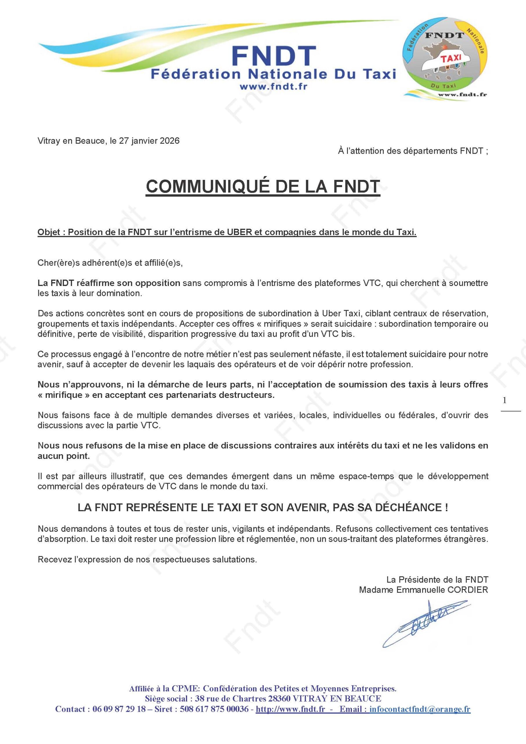 Communiqué FNDT – Vtc du 27 janvier 2026