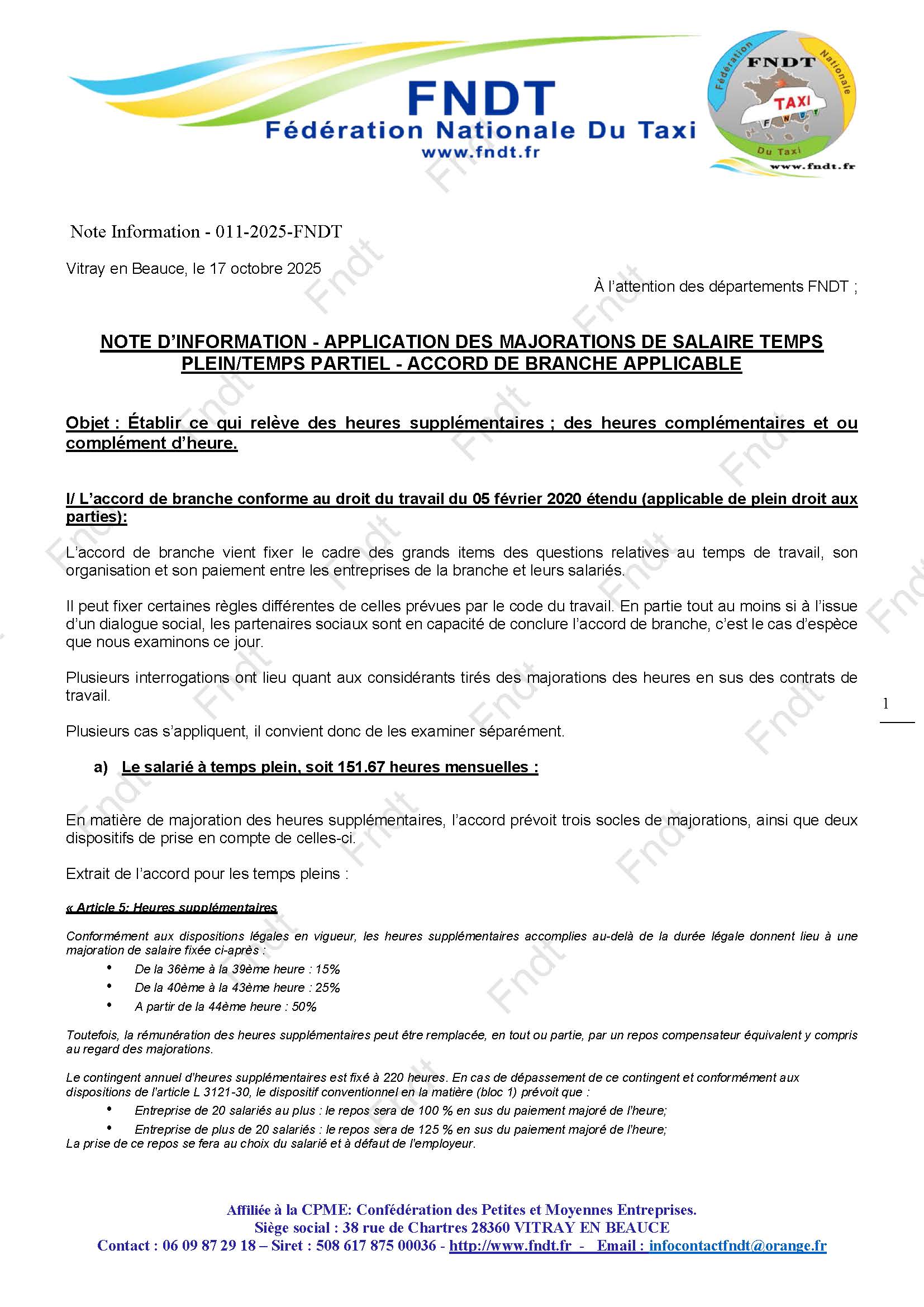 Note information- 011-2025 – FNDT – NOTE FNDT 17 OCT 25 – HEURES SUP ET COMPLEMENTAIRE BRANCHE TAXI